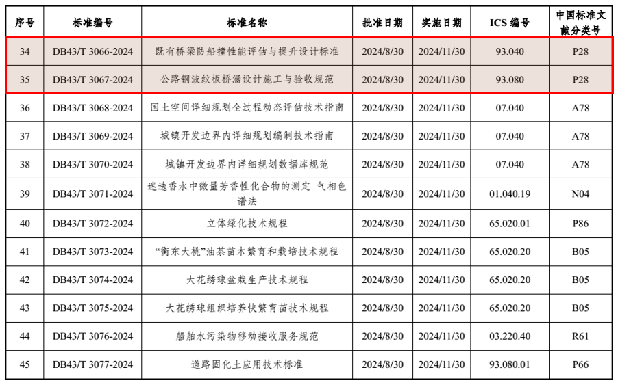 11月30日,由湖南省交通規(guī)劃勘察設(shè)計院有限公司主編的省級地方標準《既有橋梁防船撞性能評估與提升設(shè)計標準》(DB43/T 3066-2024)、《公路鋼波紋板橋涵設(shè)計施工與驗收規(guī)范》(DB43/T 3067-2024)正式實施,其中《既有橋梁防船撞性能評估與提升設(shè)計標準》填補了國內(nèi)該領(lǐng)域空白。此外,交通設(shè)計院主編的《公路橋梁預應力混凝土管樁應用技術(shù)規(guī)程》(DB43/T 3085-2024)也將于2025年2月13日起實施,為我省交通基礎(chǔ)設(shè)施建設(shè)提供有力的技術(shù)支撐。