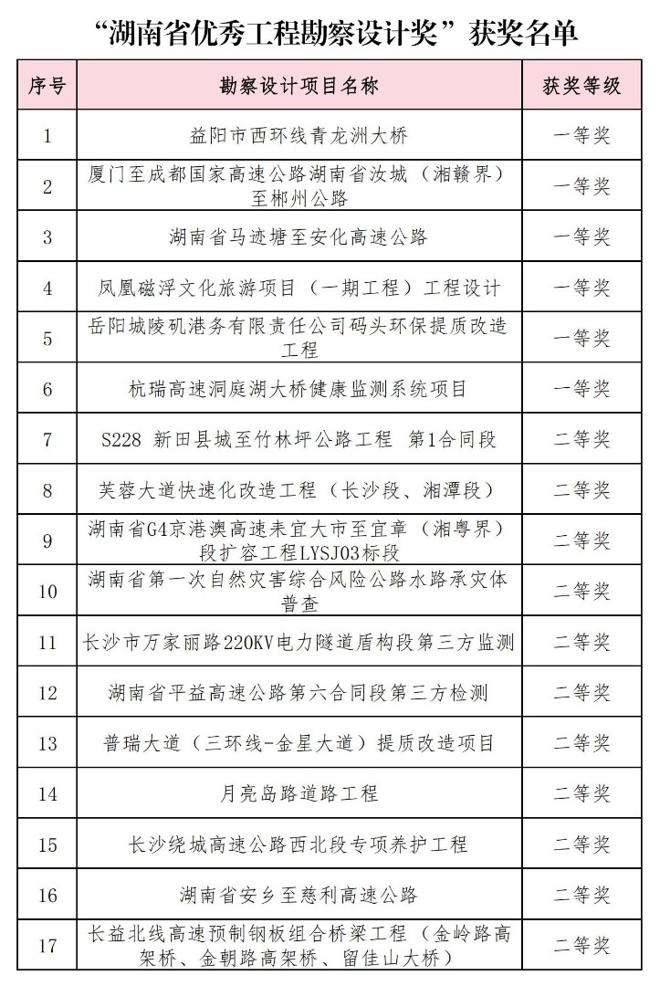 1月24日,湖南省勘察設計協會公布了2023年度湖南省優秀工程勘察設計獎評選結果。湖南交通設計院26個項目脫穎而出,共攬獲一等獎6項、二等獎11項、三等獎9項,獲獎數量創歷史新高!獲獎項目涵蓋道路、市政工程、水運勘察、市政公用工程設計、建筑工程設計、交通工程等多個領域...