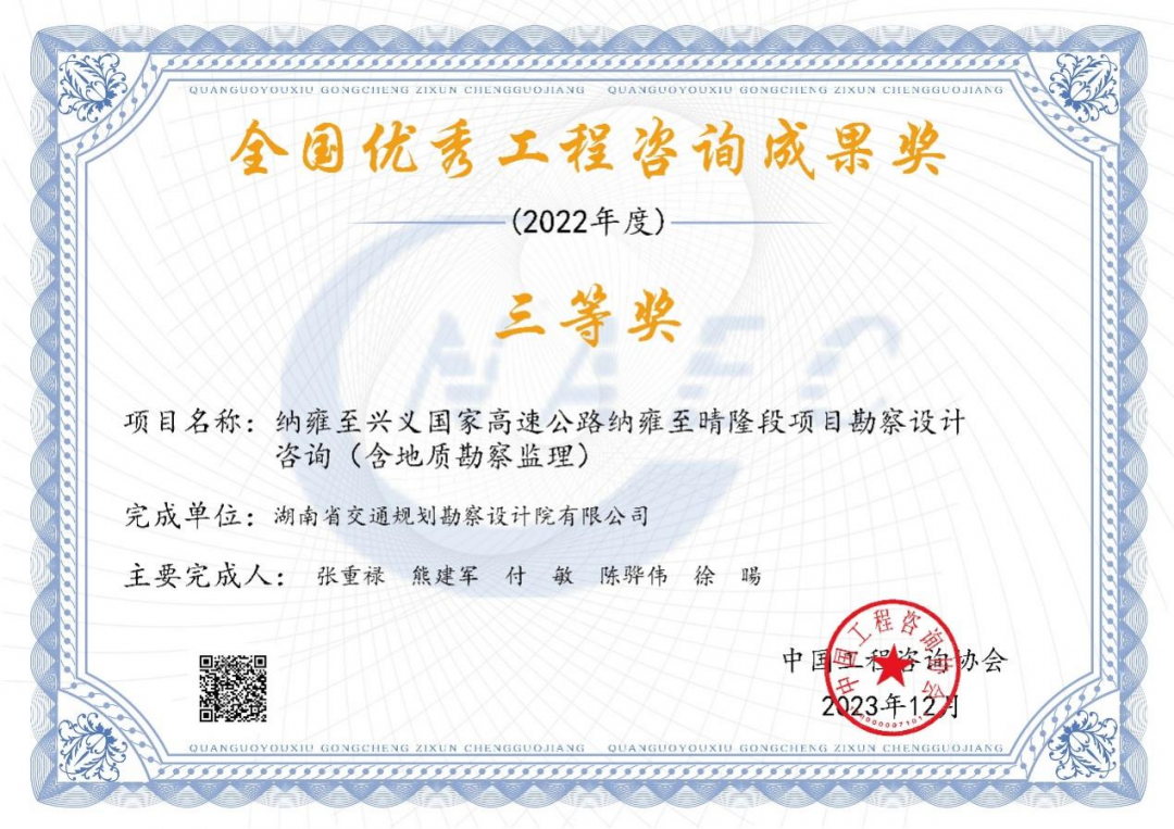 近日,中國工程咨詢協會公布2022年度全國優秀工程咨詢成果獎獲獎項目,湖南交通設計院承擔的納雍至興義國家高速公路貴州省納雍至晴隆段勘察設計監理咨詢榮獲全國優秀工程咨詢成果獎。 全國優秀工程咨詢成果獎是工程咨詢行業的最高獎項,旨在表彰和獎勵在我國工程咨詢業務...