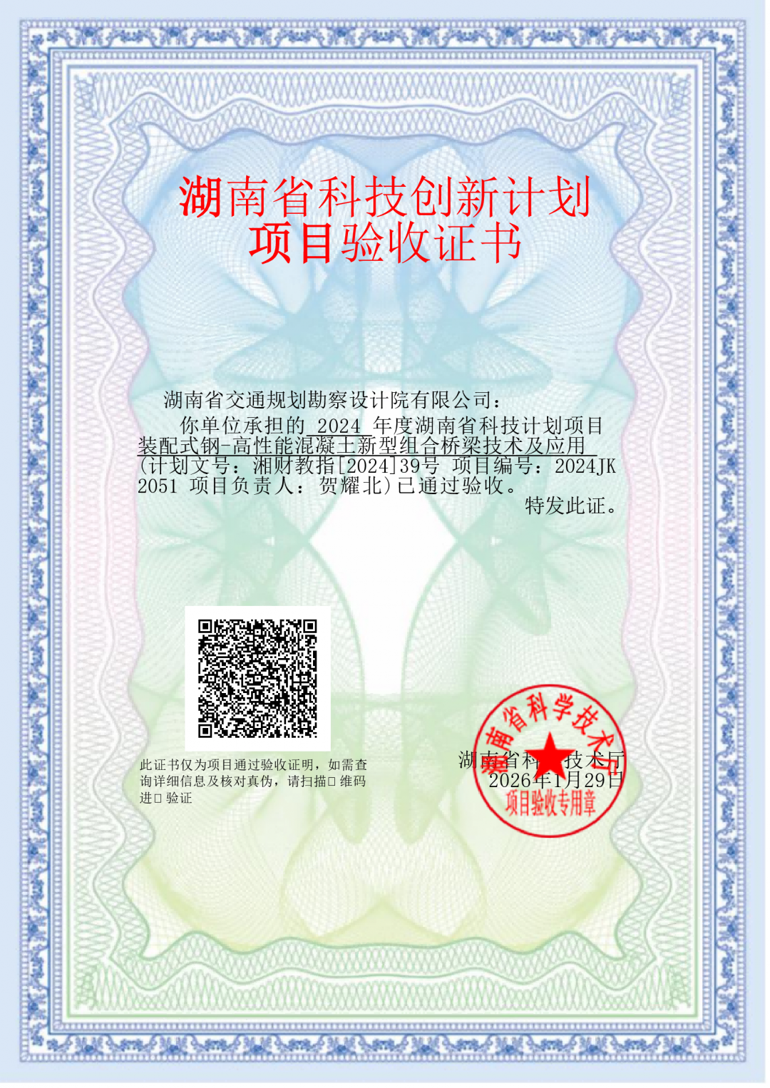 近日,湖南省科學技術廳組織專家對湖南省交通規劃勘察設計院股份有限公司牽頭承擔的湖南省重點研發計劃項目“裝配式鋼-高性能混凝土新型組合橋梁技術及應用”進行綜合績效評價。專家組一致認為,項目已全面完成任務書規定的各項指標,成果豐碩,創新顯著,同意通過驗收。該項目是2024...