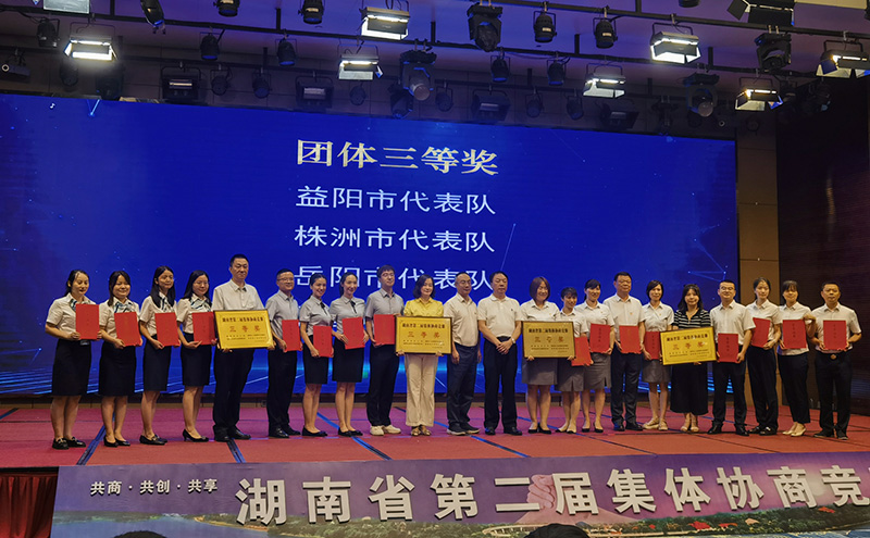 6月20日,由湖南省總工會(huì)、省人社廳、省企聯(lián)和省工商聯(lián)聯(lián)合舉辦的“共商?共創(chuàng)?共享”湖南省第二屆集體協(xié)商競(jìng)賽在郴州圓滿落幕。在集團(tuán)、公司工會(huì)、法務(wù)審計(jì)部的組織下,我司李偉強(qiáng)、李慶、彭鵬與集團(tuán)四建2名法務(wù)人員組成唯一一支省直屬基層工會(huì)代表隊(duì),在全省20支代表隊(duì)中脫穎